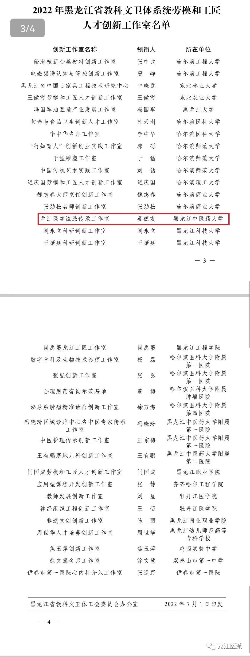 7月1日,2022年度省教科文卫体系统“劳模和工匠人才创新工作室”专家评审工作圆满完成,包括龙江医学流派传承工作室在内的33个工作室脱颖而出。