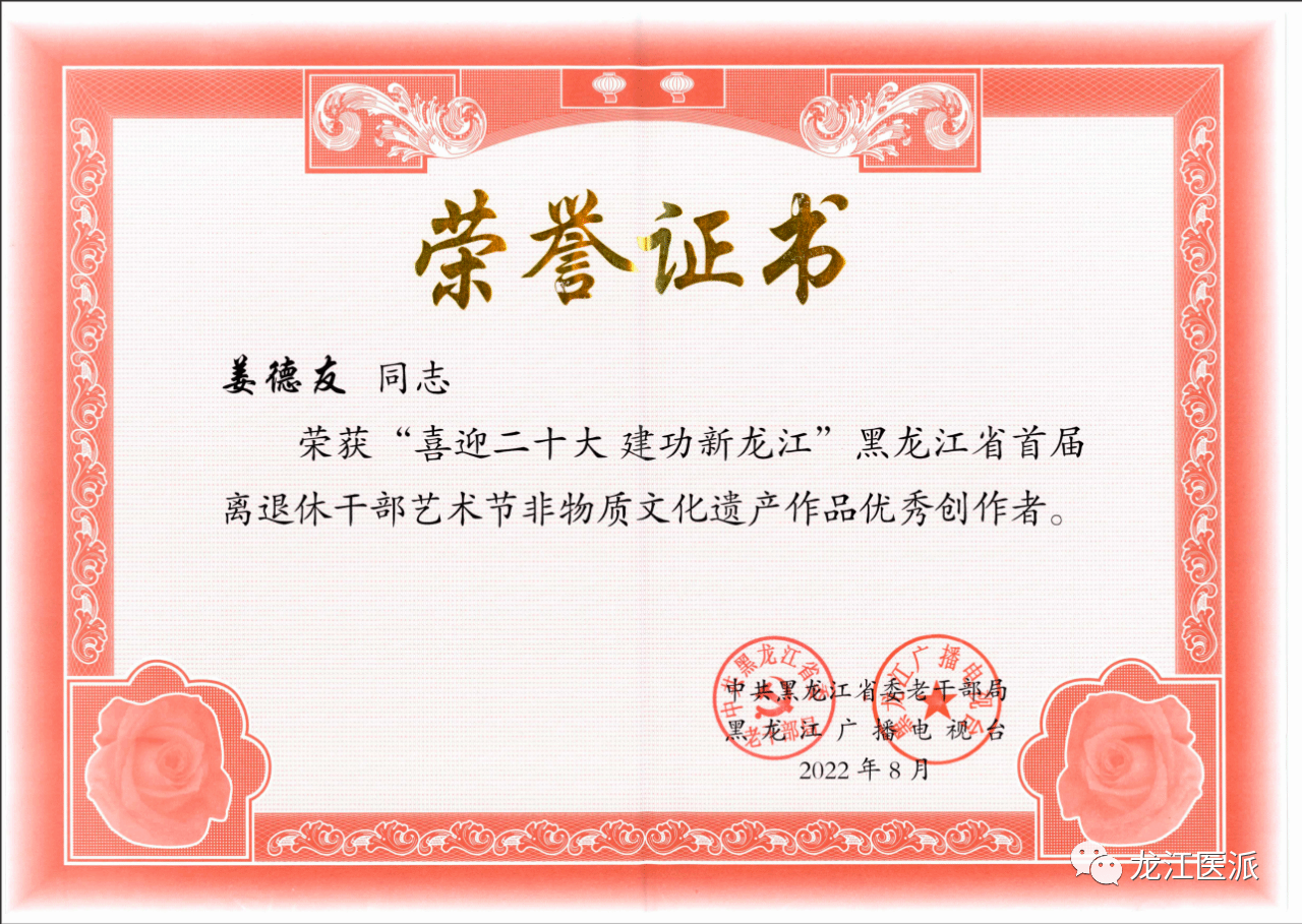 8月26日,为期两个月的“喜迎二十大 建功新龙江” 黑龙江省首届离退休干部艺术节在黑龙江广播电视台演播厅落下帏幕。龙江医派作为黑龙江省非物质文化遗产在本届艺术节的文化展览区向广大离退休干部展示了龙江医派的发展历程、学术成果、临床贡献和文化内涵,并发放《龙江医派养生备要》手册,受到参观群众的广泛关注和一致好评。主办方中共黑龙江省委老干部局与黑龙江省广播电视台在闭幕式上授予黑龙江中医药大学中医临床基础学科带头人、国家中医药管理局龙江医派传承工作室负责人、黑龙江省龙江医派研究会会长姜德友教授“黑龙江省首届离退休干部艺术节非物质文化遗产作品优秀创作者”称号。