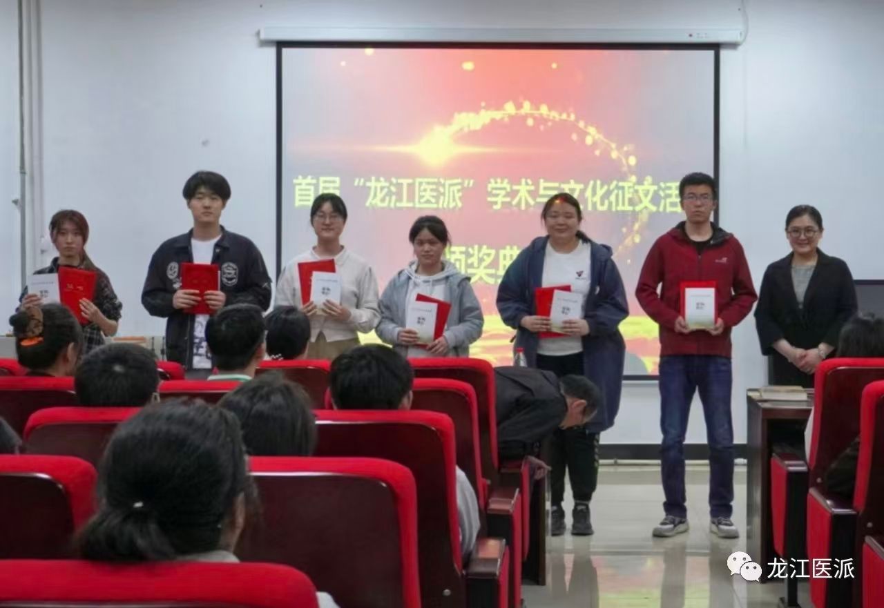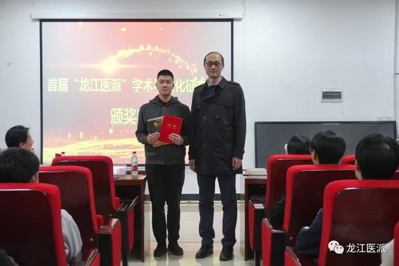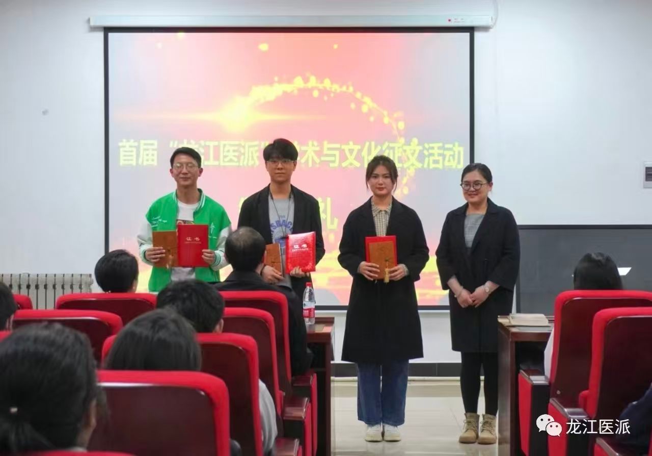 2023年4月18日,由黑龙江省龙江医派研究会、国家中医药管理局龙江医学流派传承工作室主办,黑龙江中医药大学基础医学院中医第一党支部与第一临床医学院中医药青年论坛共同承办的首届“龙江医派”学术与文化征文活动颁奖典礼在大学生活动中心圆满落幕,金甲一、赵翌辰、王佳欣、邵卓妍、刘溢儒、余子豪、赵馨叶、沈师奇、杨星羽、任永斌、杨青、马浩茗分获一、二、三等奖和优秀奖。第一临床医学院正处级辅导员、硕士研究生导师田旭升教授,基础医学院金匮要略教研室副主任、第五批全国中医临床优秀人才常佳怡副教授,中医药青年论坛指导教师、第一临床医学院辅导员张婷婷老师为获奖者颁奖。
